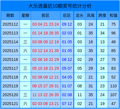 其中开出龙头号码为02,凤尾号码为21,跨度数据为19,和值数据为47;后区号码开出07、12,属于奇数+偶数、大数+大数组合号码。