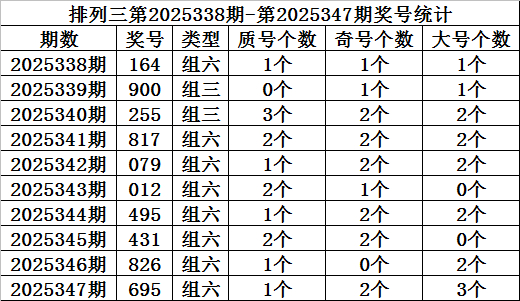 上期转头:陈列三第2025347期开奖:695,质合比为1:2,奇偶比为3:0,大小比为2:1。