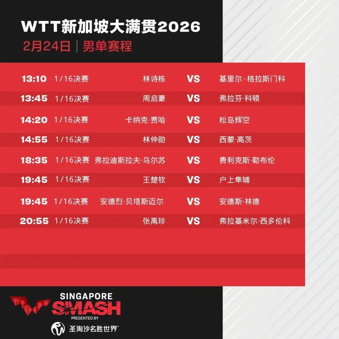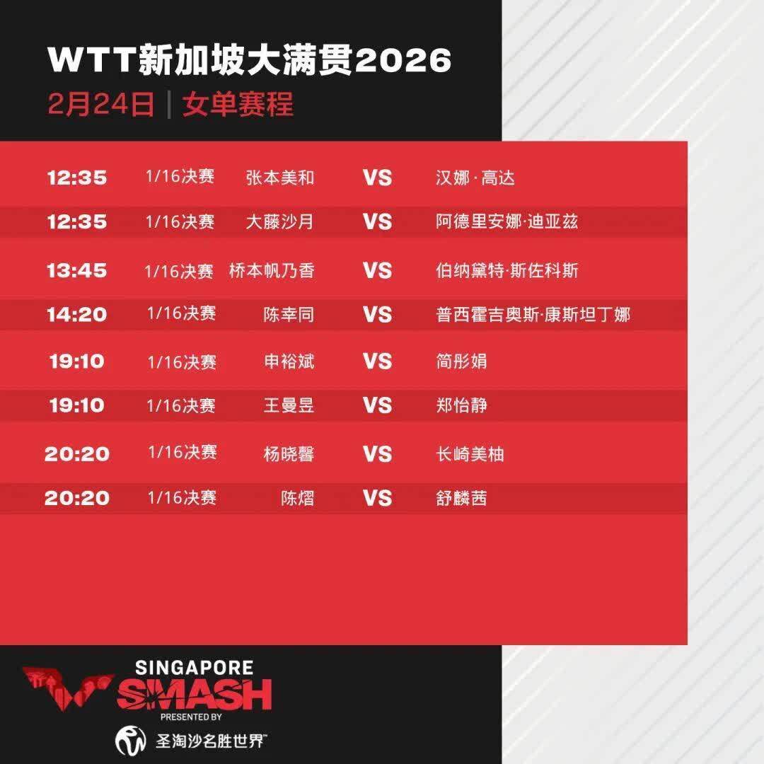 24日,2026年WTT新加坡大满贯投入正赛第三天,林诗栋、王楚钦、王曼昱、蒯曼等出场。具体赛程如下: